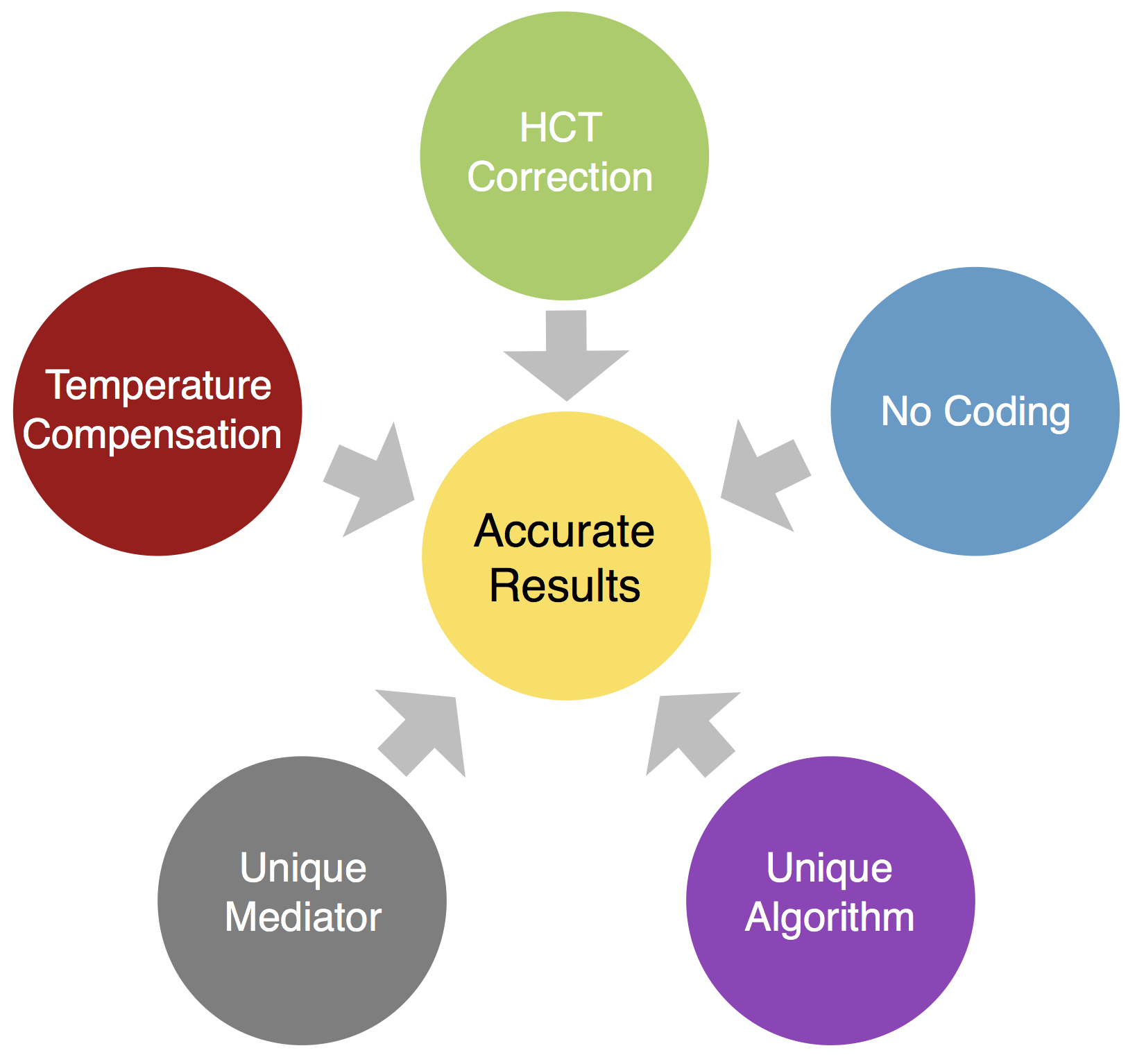 Each VivaChek Ino test strip contains 8 electrodes, auto-coded during manufacture to provide minimum batch-to-batch variation and a unique mediator for stability during the shelf-life of the strip. The meter uses a unique algorithm to compensate for haematocrit, temperature and humidity.